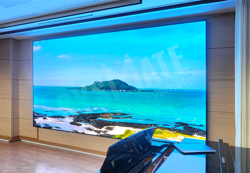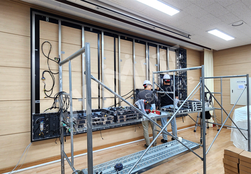 시청각실 벽면에 전용 함체를 제작해 매립형으로 설치하는 방식을 적용하여,
