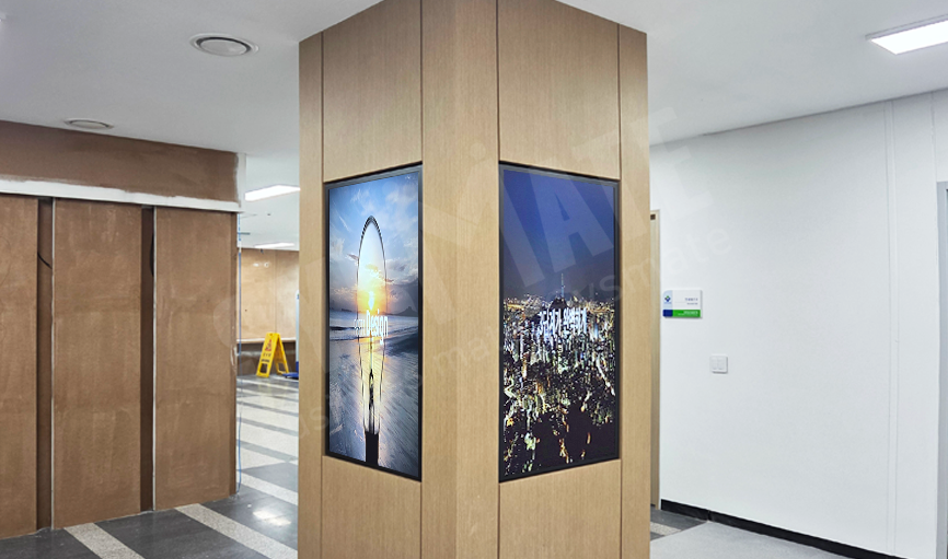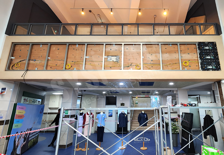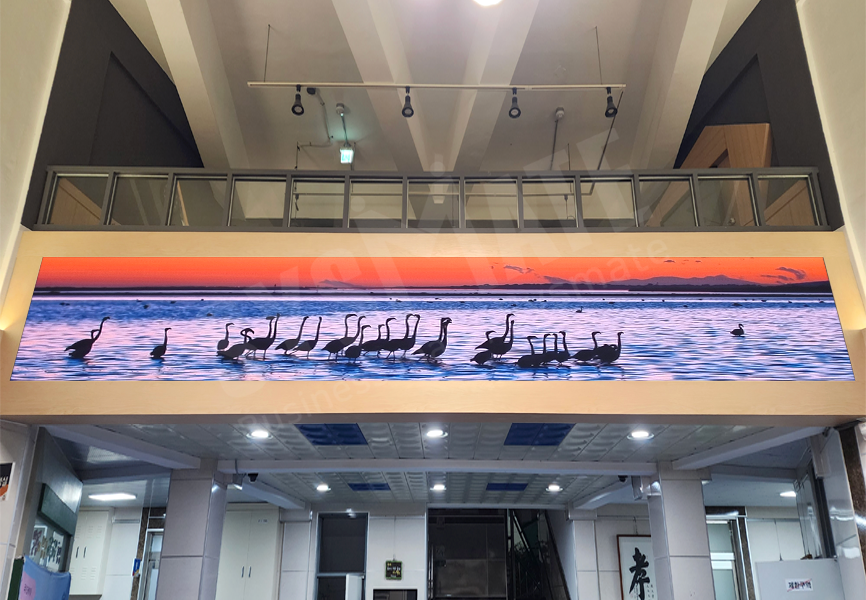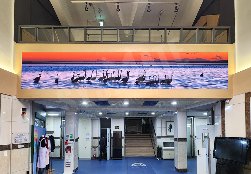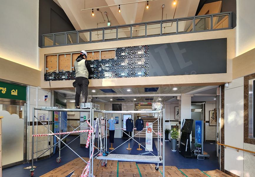 3단 11열 구성으로 시공되어 넓은 로비 공간에서도 정보 전달력이 뛰어나며,