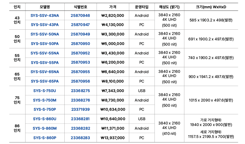 [스탠드] 55인치, 4K UHD, 500nit / [천정형] 75인치, 4K UHD, 350nit