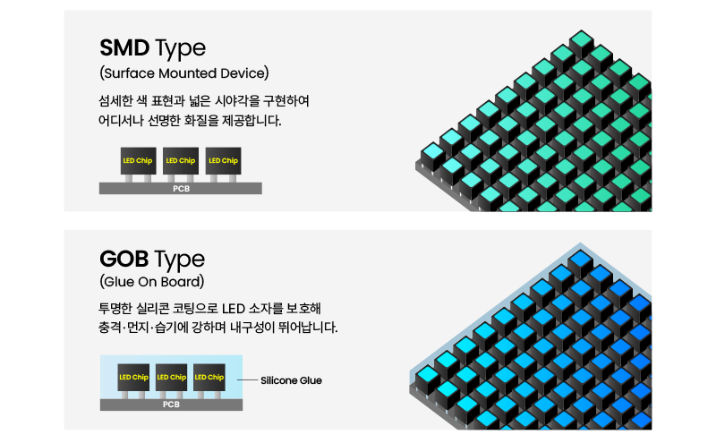 섬세한 표현력과 안정적인 운영이 가능한 SMD 타입, 보호성과 내구성이 우수한 GOB 타입으로